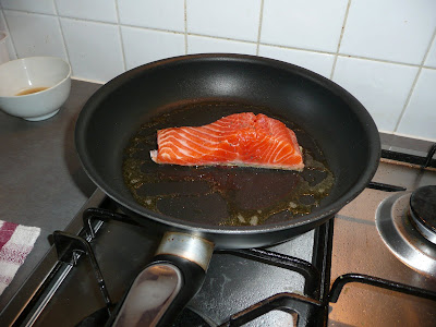 2.) Fry the fish skin side down (as yesterday, only turning it over when the skin has turned a nice crisp brown. DON’T burn it!)