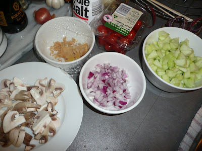The ingredients below are as such. You might note the little box of grape tomatoes.. ignore that, I decided not to use it after all =)