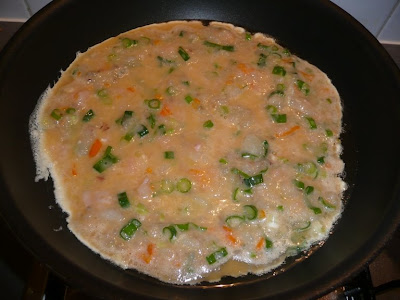 Heat up some oil in a medium pan. Make sure it is hot before putting the egg mixture in.