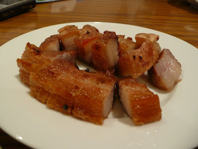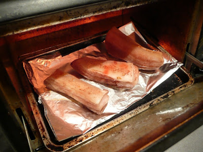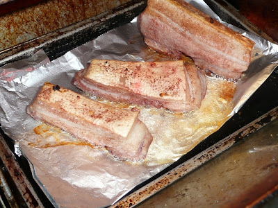 Take a couple of strips of pork belly with skin, and marinate rub with salt. Rub the meaty bit with 5 Chinese 5 spice.