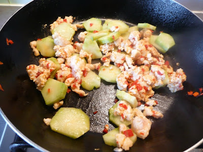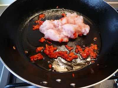 Whilst you’re boiling up water to cook the Indo Mie, heat up some oil in a pan and fry the chili first for about 1 minute, and then adding in the mince chicken