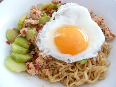 1/2 a chopped red chili, slice Broccoli stems, mince chicken, an egg and 1 packet of Indo Mie