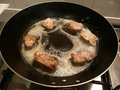 Into a hot pan they go into, to give them a crisp outer shell. You want to do this fairly quickly, so as not to burn the coating and not to overcook the chicken