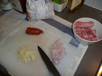 3.) & 4.) He fried the pork and chorizo separately, to maintain their crispyness.