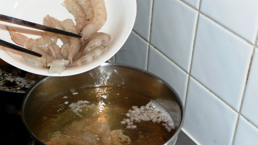 Boil the soup stock with prawn shells and heads (that is where all the good sweetness comes from!), shallots, garlic and lemongrass