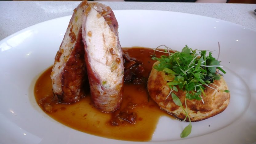 Dapeng order a Prosciutto wrapped chicken with pistachio and thyme farce, goats cheese souffle and ceps jus $35